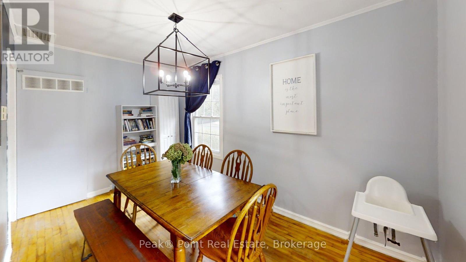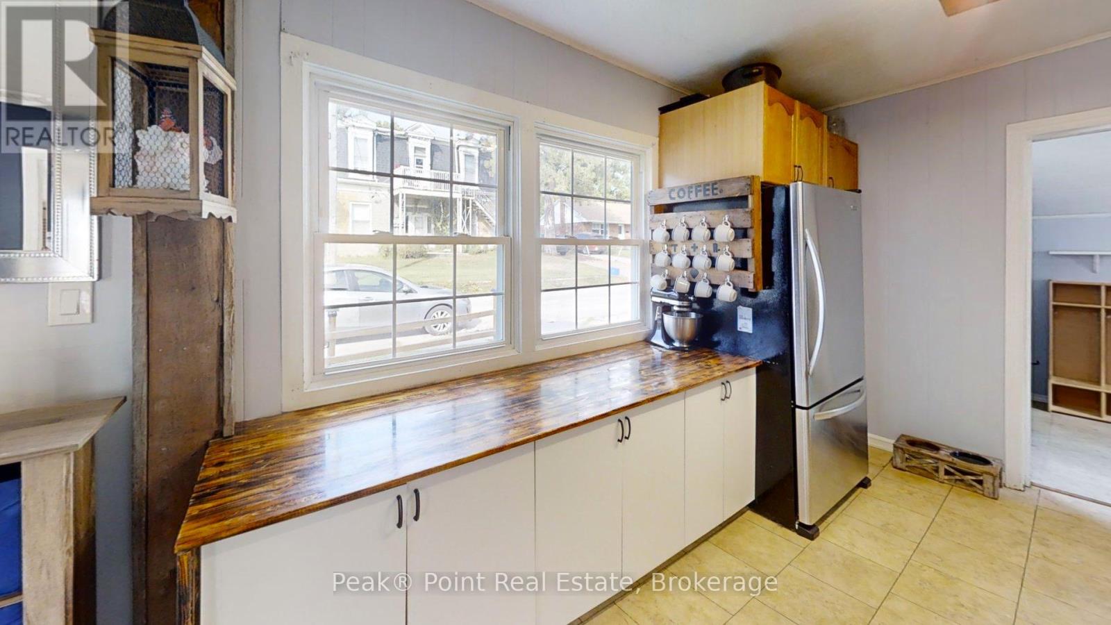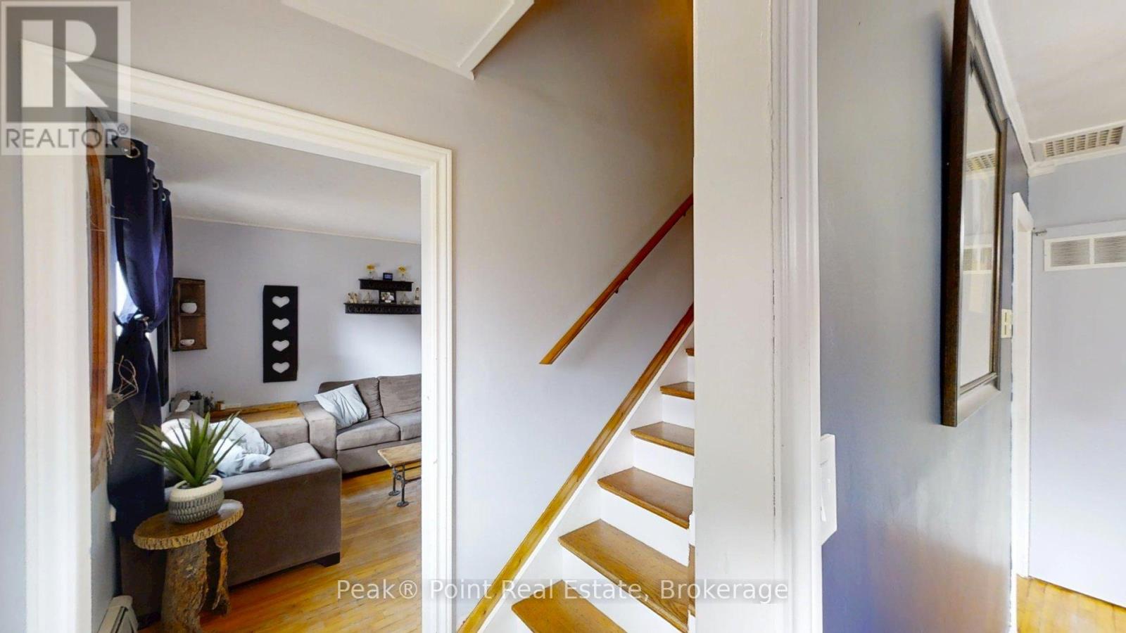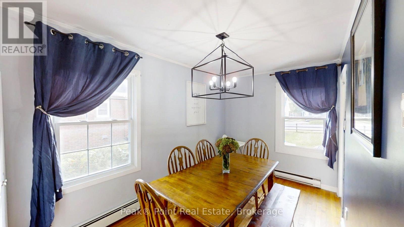 Looking for a Move-In Ready Owen Sound Home for Your Family? This quaint 1.5 storey Home is located on the west side of the city, tucked away on a lovely corner lot. The pretty front and side yards are great spaces for your kids to run and play. The mature hedging & partially fenced yard offer great visual yard boundaries. There is ample room for parking in the side/back driveway. There is a bonus detached garage/workshop which is a great space to putter, or for extra storage. Coming inside youll find the living space warm & welcoming. 3 Bed/1.5 Bath. The ground floor houses the main living areas. The kitchen is a highlight, featuring honey-colored wood cabinetry, nice appliances, and a unique custom coffee/food prep/serving station. Adjacent is a bright dining room with hardwood floors and a statement light fixture. The living room is spacious and inviting, with comfortable seating and lots of natural light from the large windows. A practical laundry room includes built-in storage and a washer/dryer set. The main floor bathroom showcases a mix of traditional and contemporary elements with a wooden vanity and tiled shower. The main floor bedroom is a great size and features built-in drawers & closet. The upstairs space accommodates two additional bedrooms + 2pc. Bath. The master bedroom is bright & has double closets. Throughout the home, hardwood floors, neutral wall colors, and rustic accents create a warm, cohesive, inviting atmosphere. The property's efficient layout and blend of modern amenities with charming details make it an appealing family home. The on-demand hot water heater & hot water rad heating make the utilities very economical & an added plus! (id:6418)